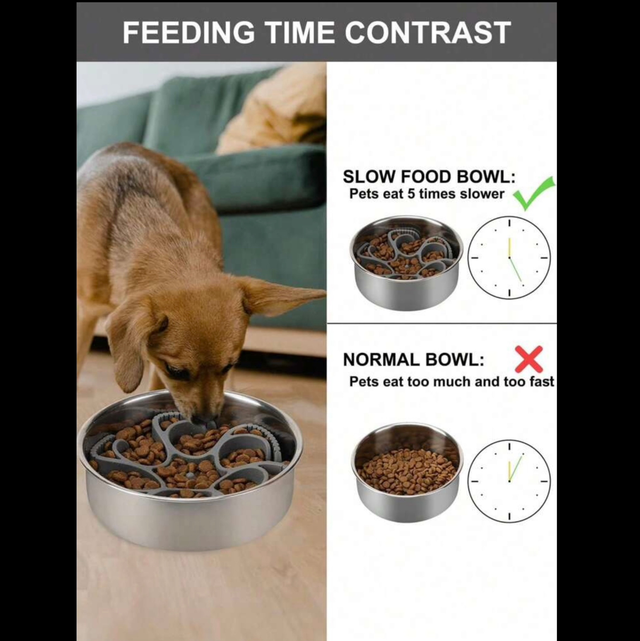 Feeding Time Contract lėto maitinimo įdėklas šunims padeda sumažinti valgymo greitį iki 5 kartų. Įprasti dubenėliai leidžia šunims valgyti per greitai, o tai gali sukelti virškinimo sutrikimų ar net pavojingą pilvo pūtimą. Įdėklas įstatomas į dubenėlį ir priverčia šunį pasistengti, kol pasiekia maistą. Tinka visų dydžių šunims – galima apkarpyti pagal dubenėlio formą. Tvirtas vakuuminis pagrindas užtikrina stabilumą ant įvairių paviršių – plastiko, stiklo, plieno ar keramikos. Lengvai išimamas, plaunamas vandeniu arba indaplovėje. Skatina šunį valgyti lėčiau, ramiau, gerina virškinimą, padeda išvengti persivalgymo ir teigiamai veikia elgesį.
